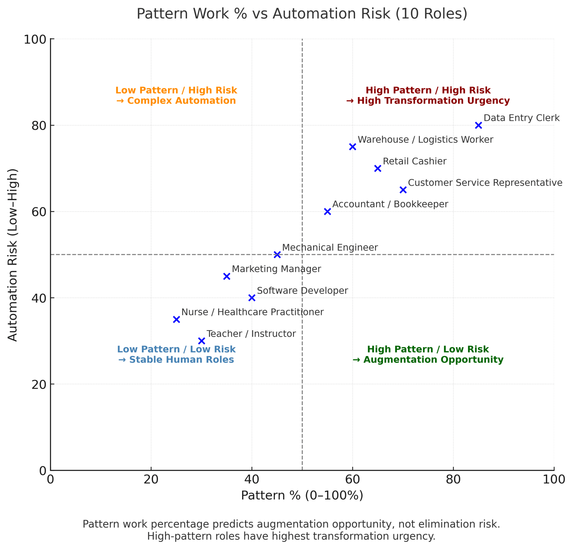 The useful question is not "Is this pattern or judgment?" but rather "What percentage of this work is pattern-based versus judgment-based?" That percentage becomes diagnostic. It tells you where AI augmentation creates opportunity and where human capabilities remain essential.